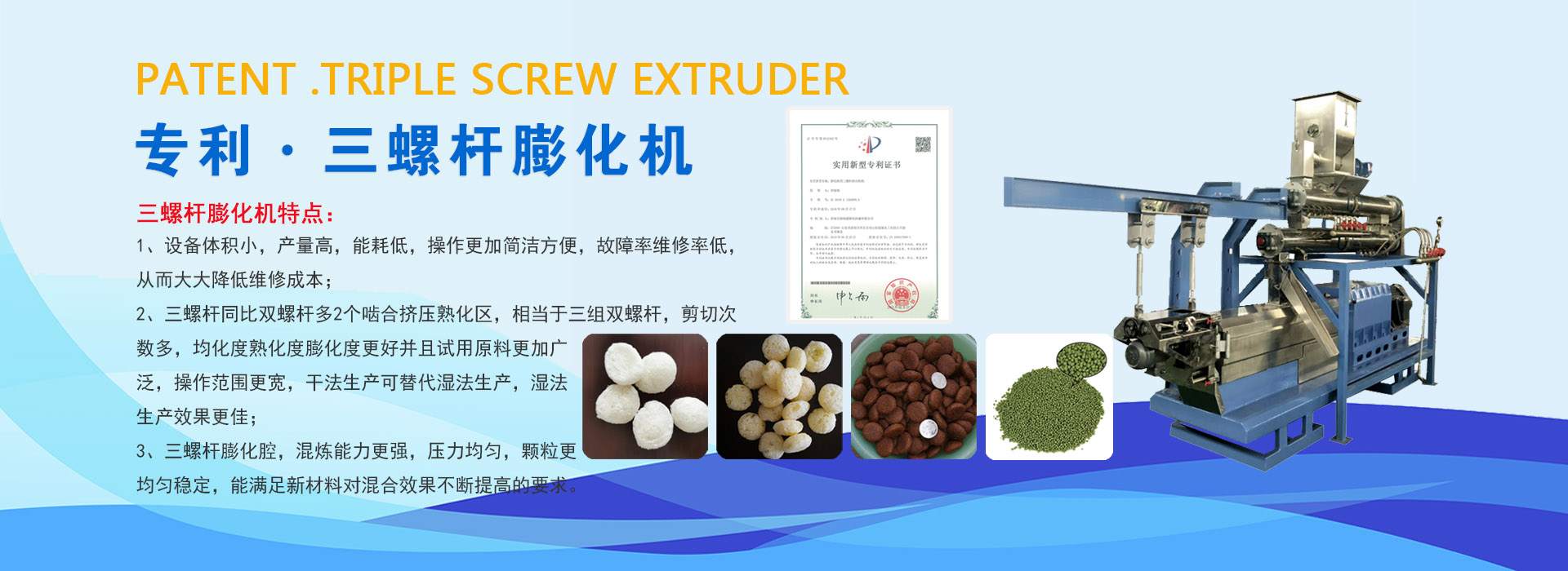 濟(jì)南百脈海源膨化機(jī)械有限公司是集科研開(kāi)發(fā)、制造培訓(xùn)、國(guó)際貿(mào)易為一體的高新技術(shù)企業(yè),并擁有國(guó)家專(zhuān)利十余項(xiàng)。十幾年來(lái)一直致力于擠壓膨化工藝及設(shè)備的開(kāi)發(fā)和研究,先后研制開(kāi)發(fā)了單螺桿、雙螺桿、專(zhuān)利三螺桿生產(chǎn)技術(shù)及設(shè)備,現(xiàn)已成為國(guó)內(nèi)主要擠壓膨化生產(chǎn)設(shè)備專(zhuān)業(yè)生產(chǎn)廠家。公司立足國(guó)內(nèi)市場(chǎng),拓展國(guó)際市場(chǎng),產(chǎn)品銷(xiāo)往全國(guó)各地,并遠(yuǎn)銷(xiāo)到亞洲、歐洲等國(guó)家地區(qū),市場(chǎng)占有率逐年增長(zhǎng)。公司將繼續(xù)進(jìn)取,勇于創(chuàng)新,與國(guó)內(nèi)外同行一起為促進(jìn)我國(guó)膨化機(jī)行業(yè)發(fā)展作出貢獻(xiàn)!